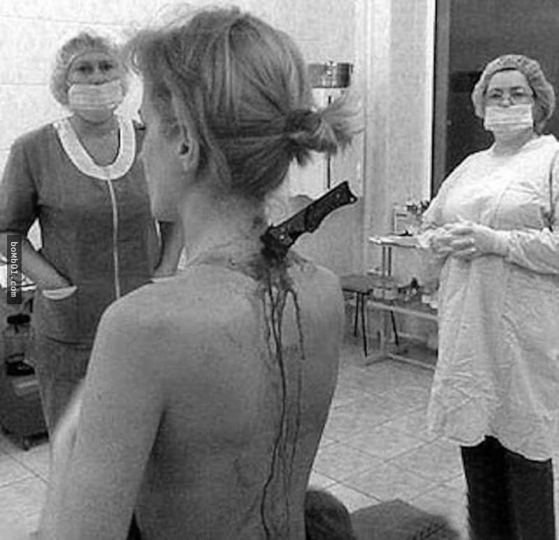 ▼6.背後一刀:這個女孩在回家路上遭遇搶劫,當時精神高度緊張,沒感覺自己背後中刀,回家後才發現。她立刻去急診室,取出刀子後並沒有生命危險。