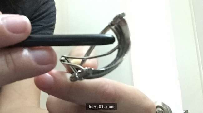 ▼2.先用眼線筆將睫毛夾塗黑,然後把睫毛夾貼在眼皮約30秒,就能畫出完美的眼線弧度!