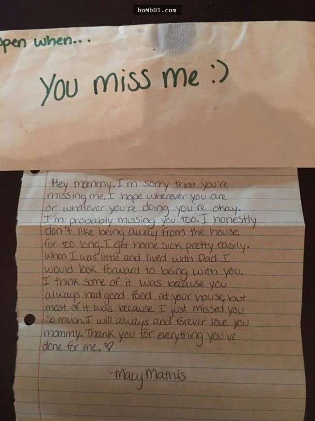 ▼這封信則是梅西要媽媽在思念自己時打開的,信裡她希望媽媽一切安好,還說自己也會很想她,因為自己有「思鄉病」。梅西或許沒預料到自己會那麼早離開,但辛蒂看著這些信,仍然充滿了感動,「這些信是我最後的慰藉,因為我知道在天堂有位體貼又了解我的女兒。」