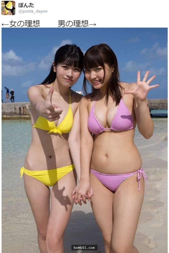 ▼最近一位日本網友分享的圖片獲得了上萬網友迴響,明確點出了女生審美觀與男性審美觀其實存在著極大的差異,以下圖為例,女生心中的理想體型是左邊,而男生的理想體型卻是右邊較為肉感的女子!