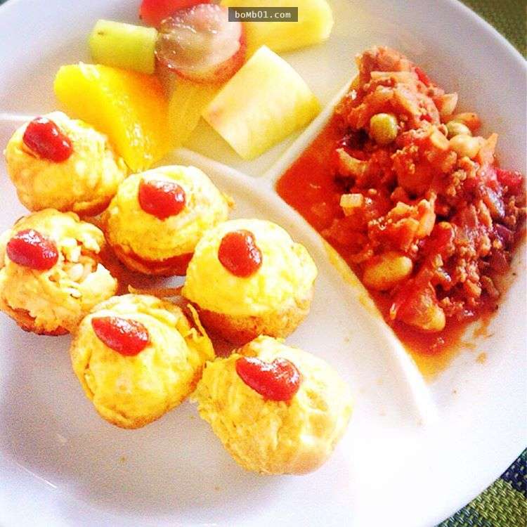 ▼蛋包飯:先加蛋液,然後放飯,最後加一點醬料,非常簡單。