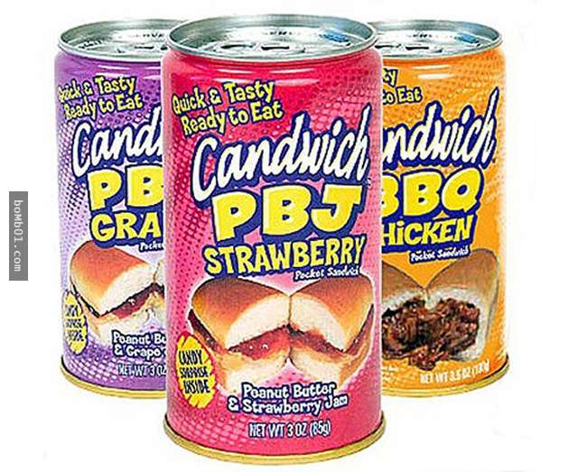 ▼5.罐裝三明治:草莓果醬口味、黃勝醬口味、烤雞口味。