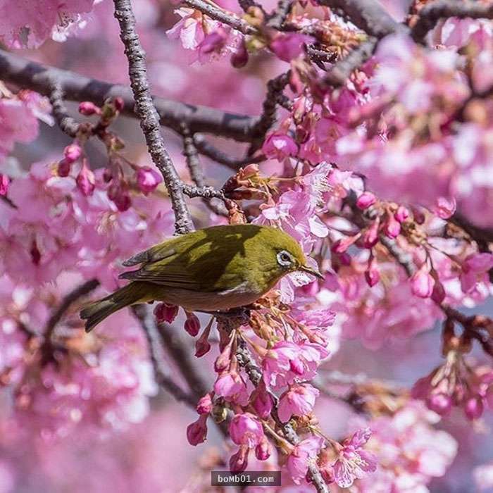 ▼櫻花樹叢中可以看到白眼鳥,牠們吸食花蜜,非常可愛。