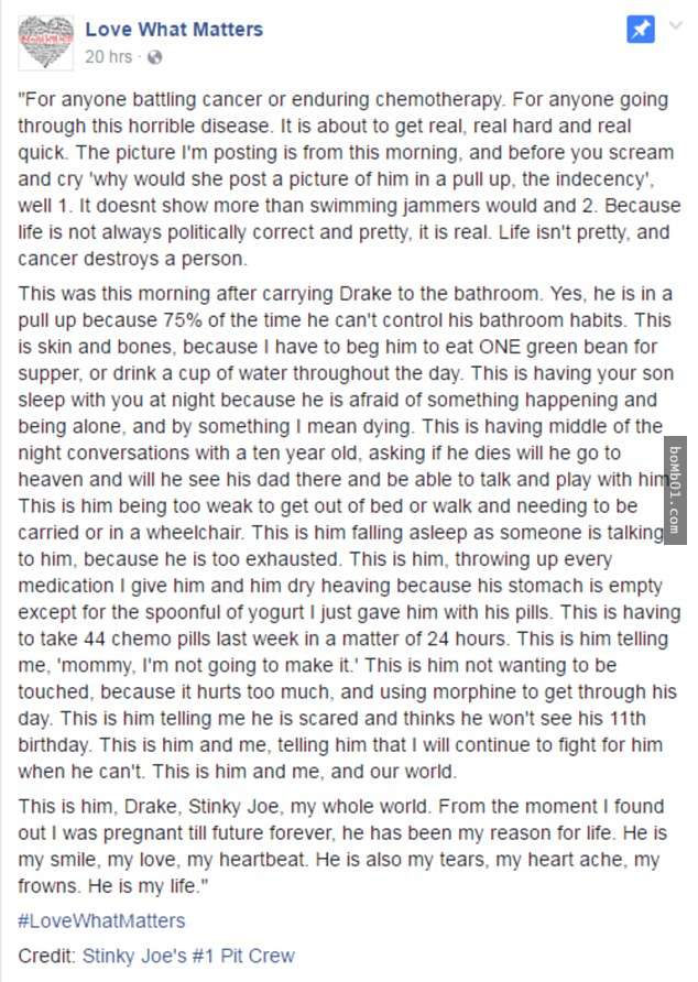 ▼Jessica知道,將這張照片分享到網路會引發爭議,有些人覺得殘酷,甚至不得體。但她只是想讓全世界知道,她的兒子有多勇敢。一天中75%的時間裡,Drake無法控制排泄,所以必須用尿布。他一天要吃44片藥,根本吃不下任何東西,為了讓他吃一粒綠豆當晚餐,Jessica需要努力很久。與人聊天時他會在中途睡著,因為他真的太疲憊了。