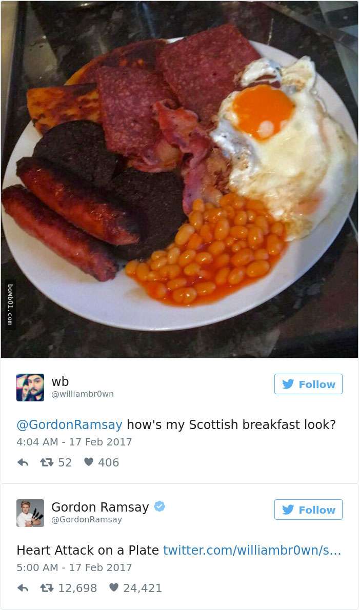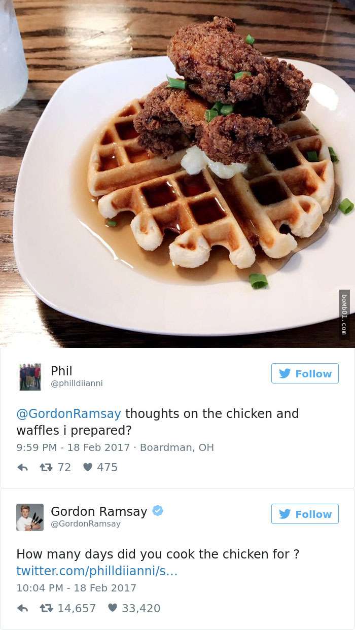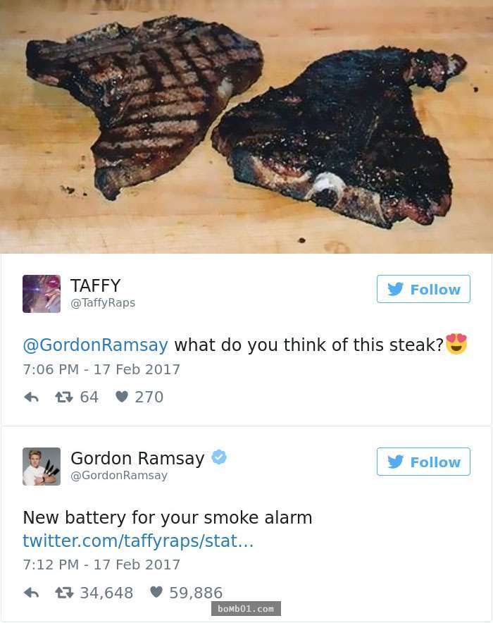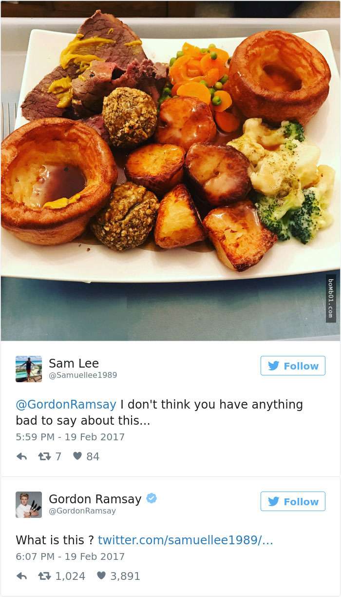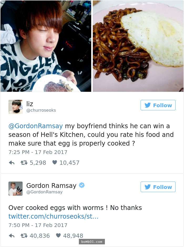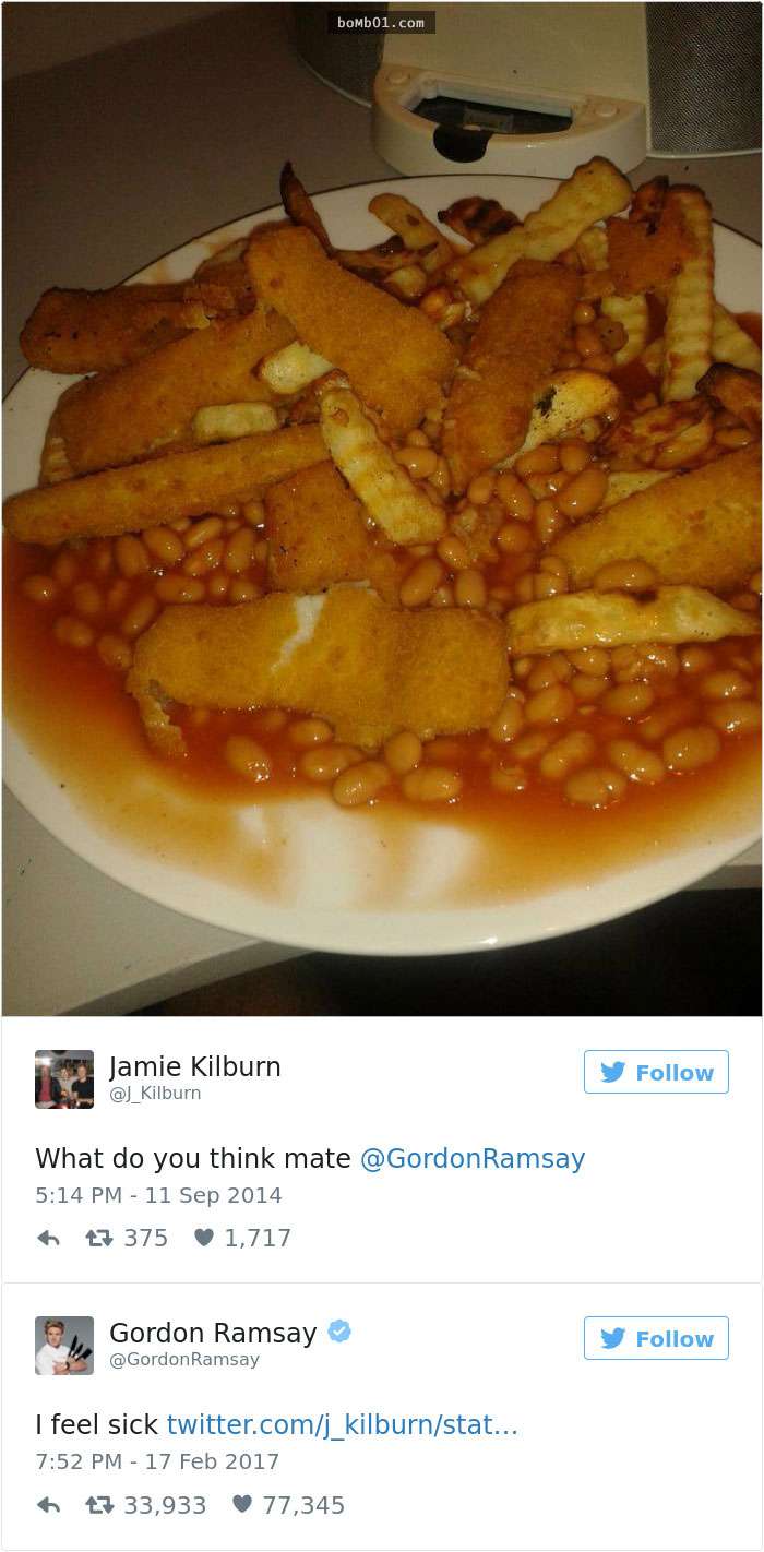 2017年02月24日英國米其林三星主廚高登蘭姆齊(Gordon Ramsay)是很多人心中的「廚神」。他言詞犀利,很有個性,所以大家把自己做的料理照片分享給他看時,沒幻想得到正面積極的鼓勵,但粉絲們顯然還是低估了他的毒舌程度,很多人的主廚夢就此破滅了。