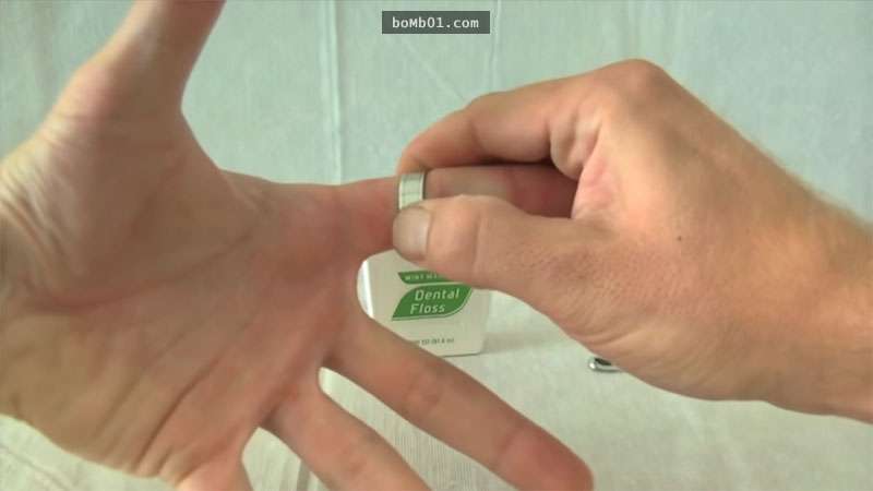 ▼先將牙線穿過戒指,順著手指不斷繞圈,交叉固定;然後拉另一頭線順著繞線方向鬆開,這樣戒指就能慢慢滑出。