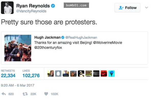 2017年03月11日對喜歡金鋼狼的人來說,《羅根》是一部不得不看的電影。最近,Hugh Jackman到北京宣傳獲得熱烈迴響,他還在社群網站分享了首映會的照片,沒想到竟然引來老朋友「死侍」Ryan Reynolds的調侃。