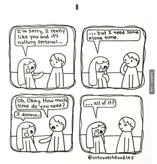 ▼8.女:「我很抱歉,我很喜歡你,我真的不是針對你。」女:「我只是需要獨處的時間。」男:「好吧,那你大概需要多少時間?」女:「我不知道…大概是所有的時間吧?」