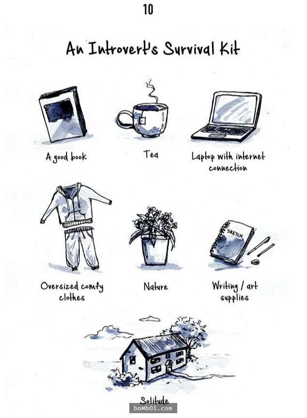 ▼13.內向的人必做的4件事:讀書、創作、不理會門鈴(因為誰會不事先通知就出現?)、吃零食。