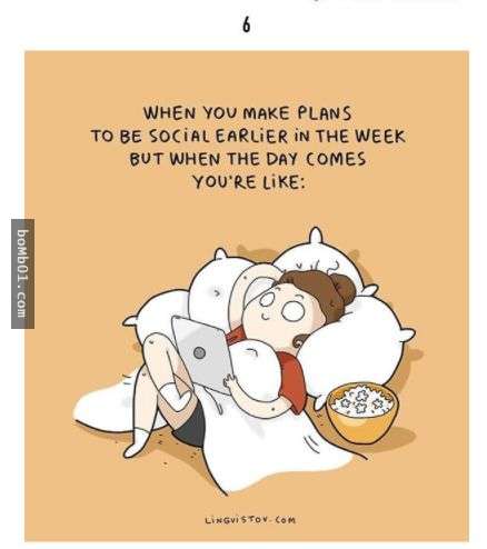 ▼6.當你在這個禮拜剛開始已經做好要外出社交的計畫,可是當約定的日子到來你卻躺在家裡啥也不做。
