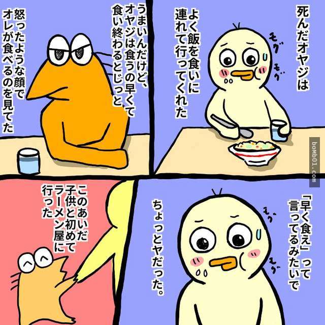 ▼一名日本插畫家@yakiunooniityan在推特上上傳了這篇與父親互動的短篇漫畫。故事中的主角在父親過世後回想起,小時候父親帶他出門吃飯的時候,總是很快的就吃完,剩下年幼的他慢慢吃,每次他一抬頭,就會看到父親用「看似生氣的表情」盯著他,他本來以為爸爸那樣看著他是為了想要催促他吃快一點,直到自己當了爸爸,帶著小孩去吃拉麵後,才瞬間頓悟了真正的原因。
