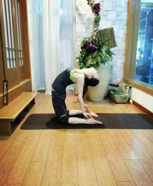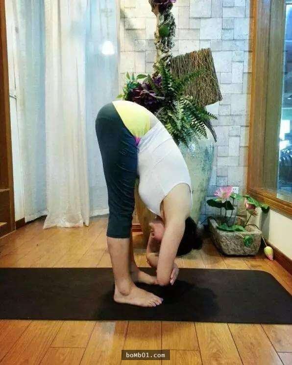 需要注意:腹部內收,腰背拱起。在此維持3-5分鐘。吸氣,頭部帶動身體緩緩直立,呼氣,全身放鬆。
