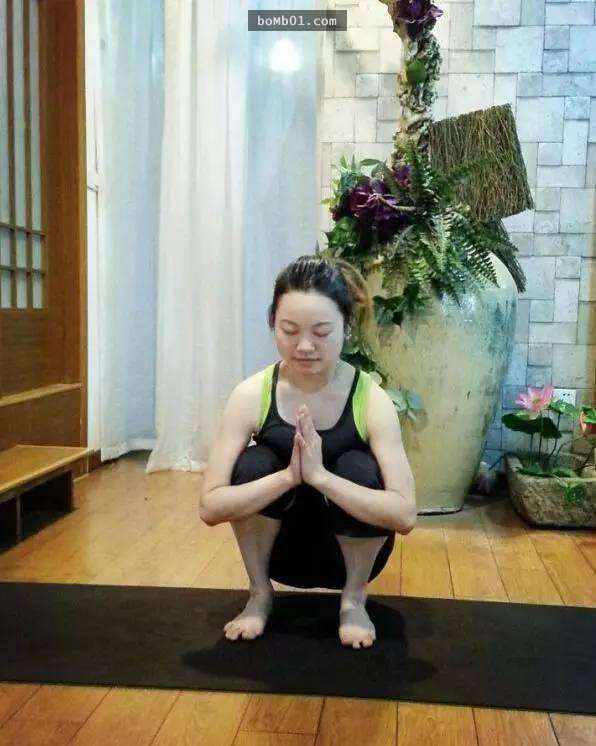 做法:在懸掛式的基礎上,鬆開雙手,屈膝下蹲,雙臂繞過雙膝外側,雙手胸前合實。注意:腰背挺直,目視前方。在此維持3分鐘。呼氣,鬆開雙手,臀部坐於墊子上,兩腿前伸,抖動,放鬆。
