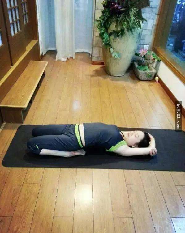 做法:仰卧在墊子上,腹部內收,腰背貼地,雙膝分開,腳尖朝外,雙手攤放在身體兩側,掌心朝上,微閉雙目,平緩呼吸。
