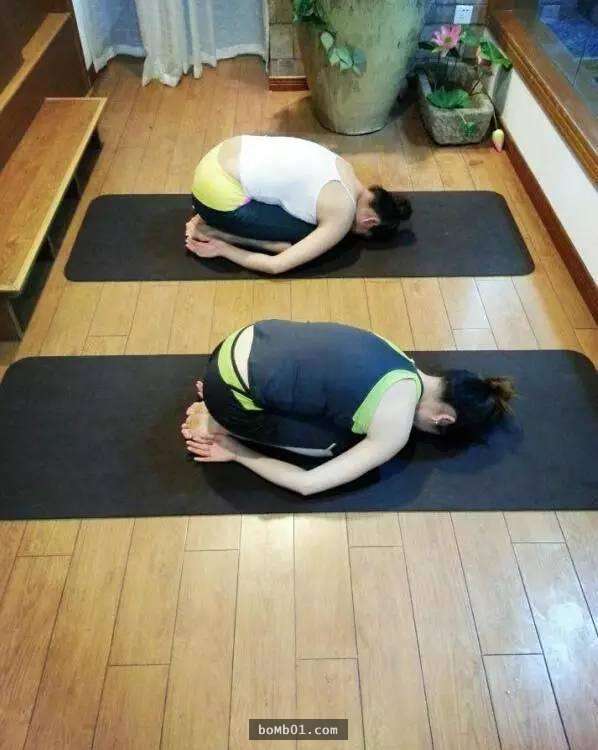 在此維持3分鐘。鬆開雙手,雙肘體側撐地,吸氣,雙臂用力向上撐起身體成坐立,呼氣,身向前傾,前額觸地,全身放鬆。