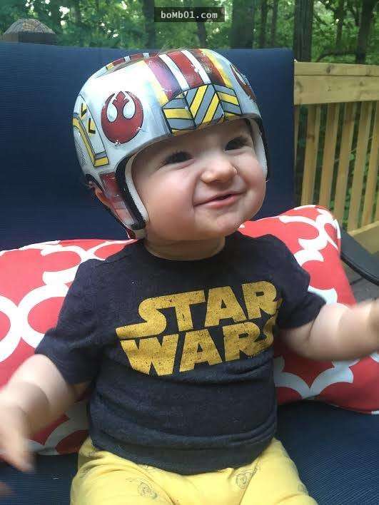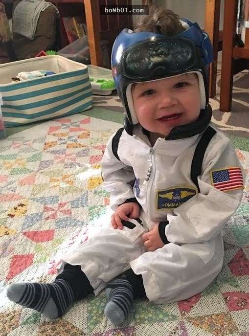 ▼這個可愛的頭盔讓他變成了小小飛行員!