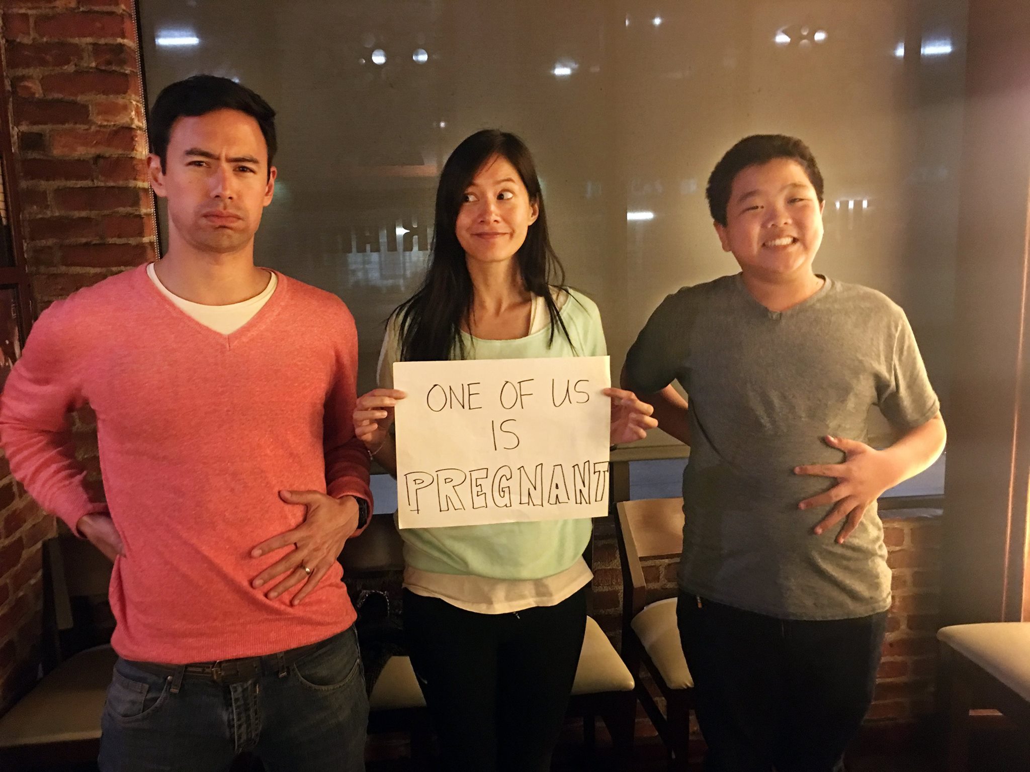 ▼Janet在臉書上PO出了與美國連續劇《菜鳥新移民》童星的合照,並拿著牌子打趣寫著:「我們之中有一個人懷孕了。」無疑是在宣告好消息,本來網友們還有點擔心是愚人節玩笑,但經紀人隨後出面證實:Janet懷孕是真的!