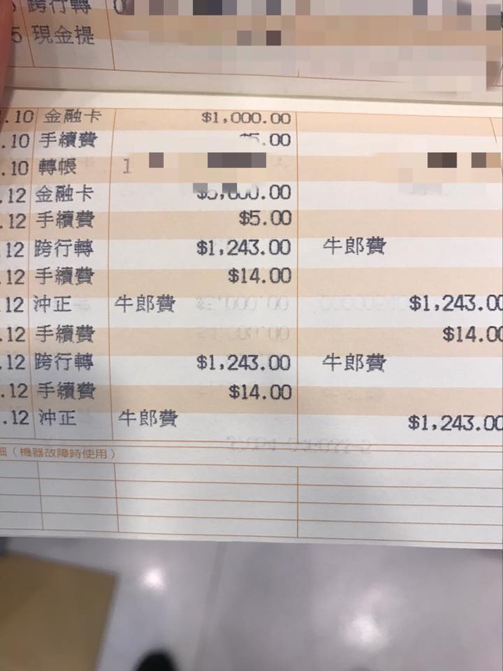 2017年04月18日最近,一名網友去銀行補刷存摺,上面除了正常的交易明細外,竟然出現了2筆「牛郎費」,每一筆都是1243元。這當然不是他的錢,而是別人匯錯到他的戶頭,已經沖正了,但他還是看到了其中的亮點,忍不住問:「各位廢友牛郎費都這麼便宜嗎……?我以為都是像夜王那樣……」