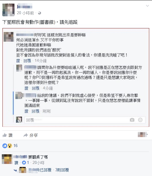 ▼不過事情還沒結束,這名母親在自己的私人臉書上留言表示,下星期會對圖書館「有動作」,還要對在留言謾罵她的64名網友提告。
