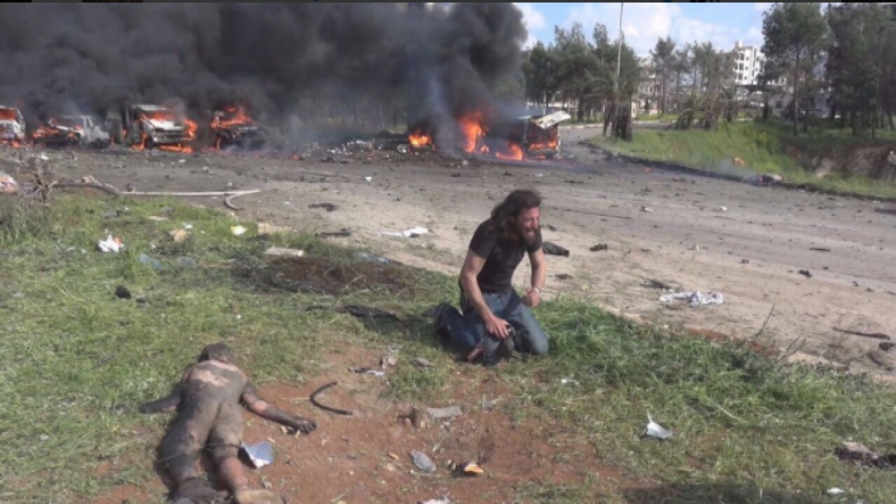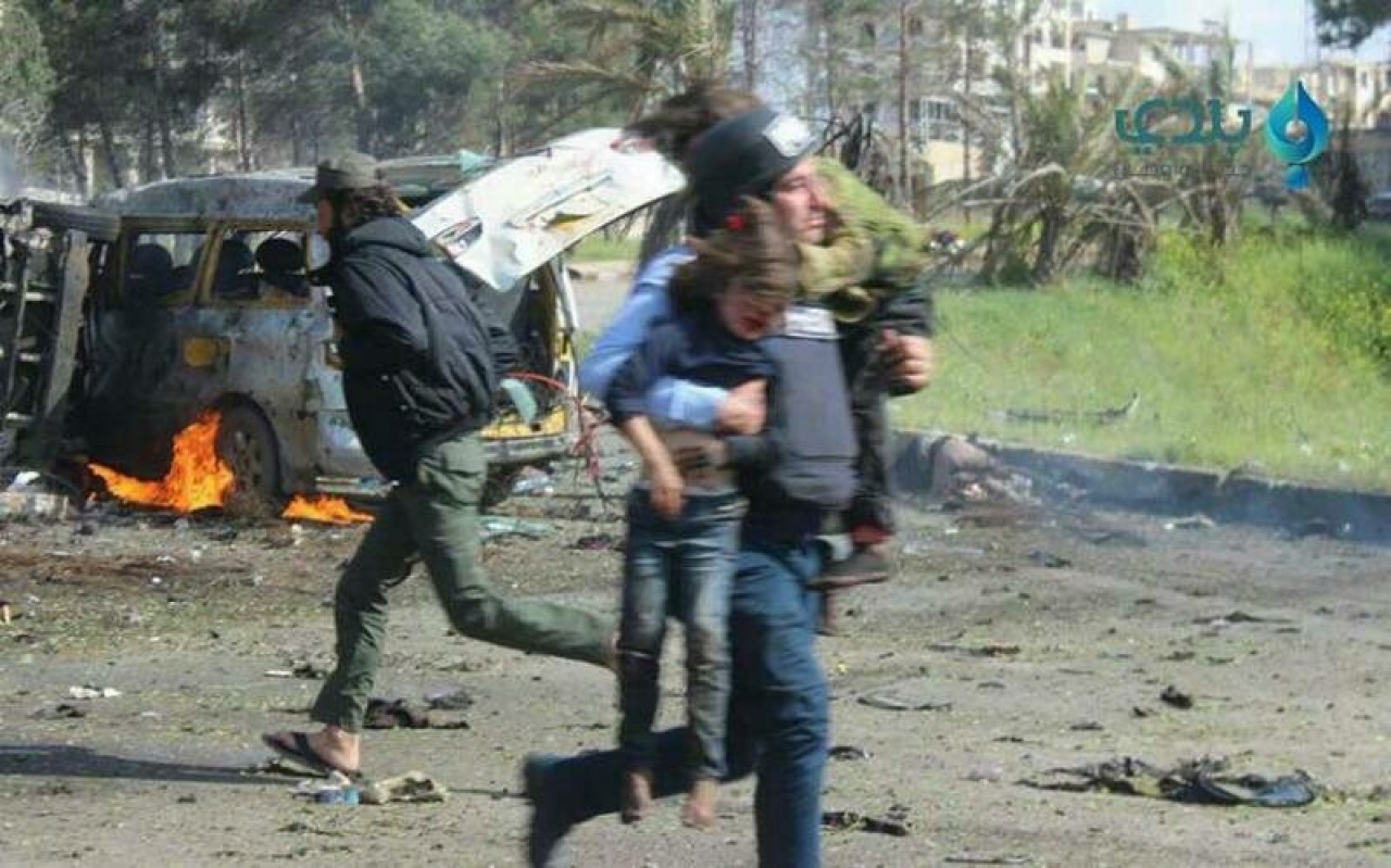 ▼4月15日,敘利亞一輛載滿難民的巴士在路邊停靠時,一輛汽車突然發生爆炸,當時巴士附近剛好有團體在配發零食和糖果,造成當時一群孩子也圍在那邊。爆炸發生時,攝影師哈巴克(Abd Alkader Habak)正在附近工作,他也被爆炸的氣流震飛,當他回過神時,發現到處都是小孩的屍體。