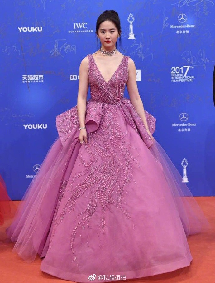 ▼很多女星喜歡穿Zuhair Murad走紅毯,劉亦菲選擇的是紫粉色鑲珠飾的2017春夏系列高級訂製禮服,蓬紗、皺褶等元素非常夢幻,公主氣息十足。不過這款禮服的大V字領口能夠露出雪白酥胸,在青春的少女氣息中加入了點點性感誘惑。