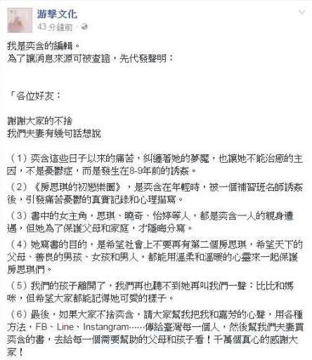 ▼噩耗傳出後,林奕含的父母在臉書上發表聲明,表示林奕含真正的死因不是重鬱症,而是在高中時期被補習班名師誘姦,而出版的書籍裡頭多位女主角便是林奕含的自身寫照。林奕含的編輯也出面證實此事,引發一陣譁然。
