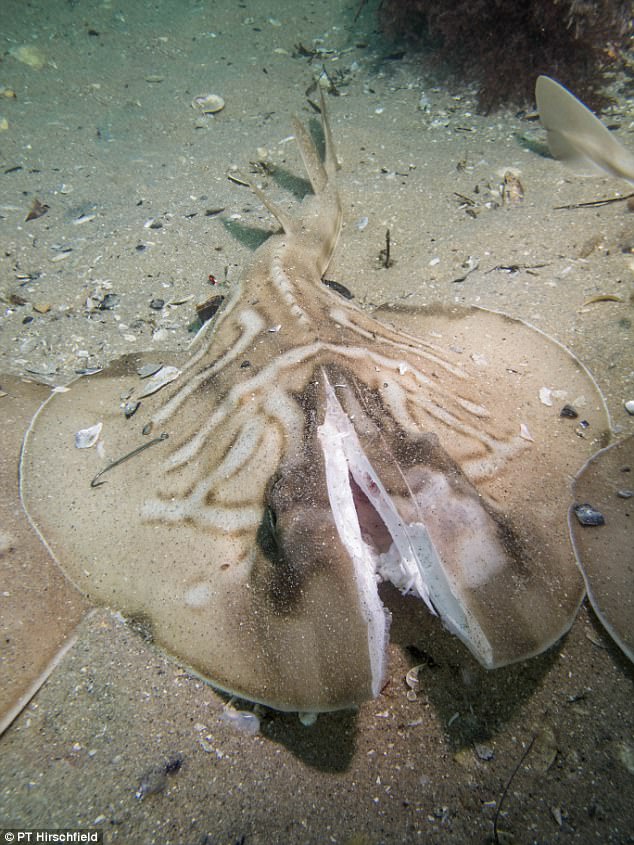 ▼剛開始,潛水員在海床上發現了五隻頭部被劈開的提琴鰩,牠們的傷口怵目驚心。