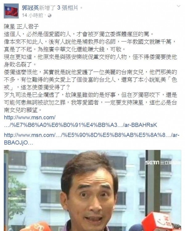 ▼郭冠英在臉書上表示:「陳星正人君子。這個人,必然是個愛國的人,才會被歹獨立委媒體瘋狂的罵。」並認為陳星是因為跟張安樂統促黨交好的人物,倭獨才要讓他身敗名裂。「倭獨這麼恨他,其實就是說他愛護了一位美麗的台南女兒,他們那美的不多,有位難得的美女愛上了個俊富的台北人,還寫了本小說胤美『色戒』,這怎使倭獨受得了?」叫大家一定要支持陳星,「這也必是台南女兒的願望。」