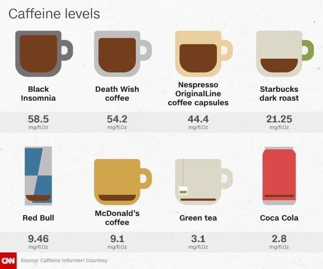▼看看這張圖片,一杯「死亡願望」相當於21.6罐可樂,19.5杯茶,6.7杯麥當當嘎逼,6.4罐紅牛,2.85杯星巴克黑咖啡,更是1.03倍「黑色失眠」。
