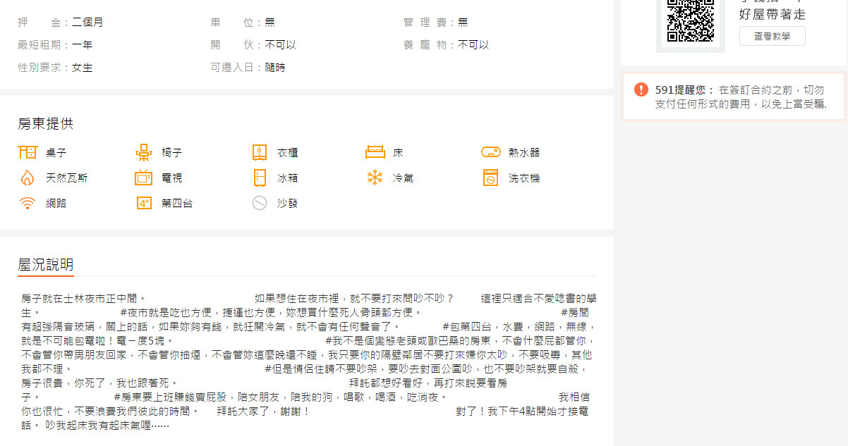 ▼這間位於士林夜市的套房刊載在591上,而房東在標題上寫了「請看下面」,但屋況、價格基本上都很普通,直到拉到屋況說明,才讓大家眼睛一亮。