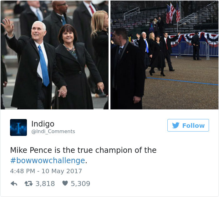 ▼在這場「鮑沃挑戰」中,印第安納州州長麥克·彭斯(Mike Pence)是當之無愧的冠軍。請問你到底在向誰招手?觀眾席上根本沒有人……