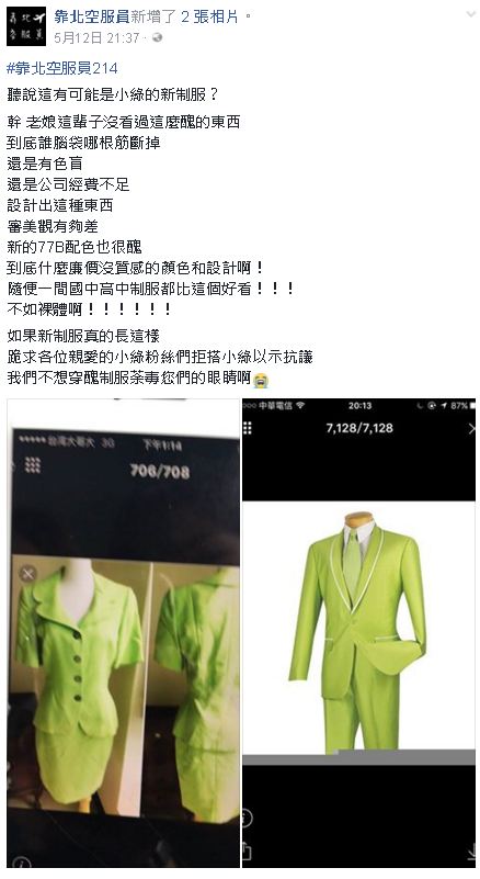 2017年05月17日長榮航空空服員的制服在下半年將會有變換,因為長榮航空總經理去年曾表示新制服的主色調仍然是綠色,不過會變得比較淺,而且樣式將會大改。如今新制服推出的日期越來越近了,網路上也瘋傳幾組疑似長榮新制服的圖,讓空姐看了崩潰大喊:「還不如裸體!」