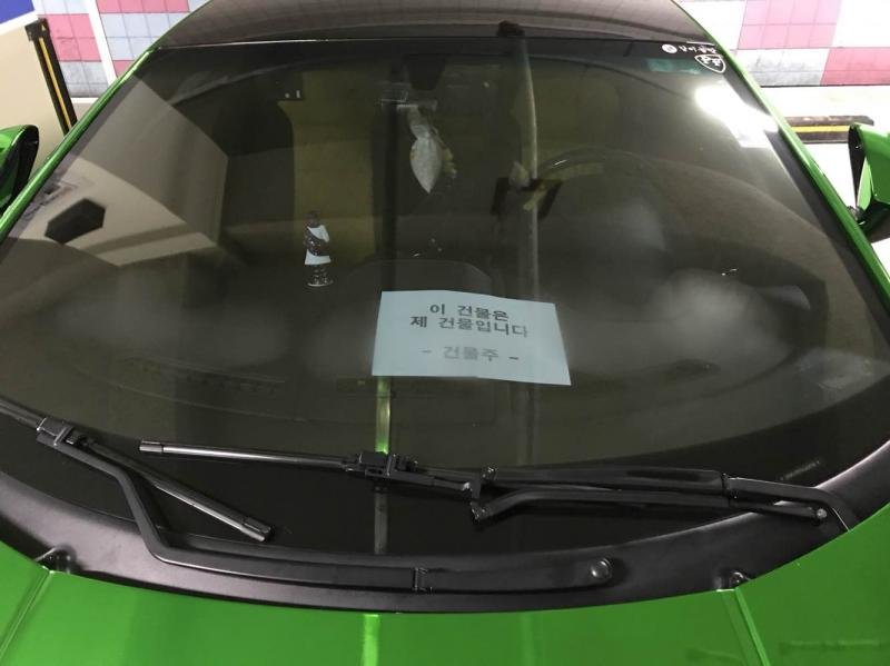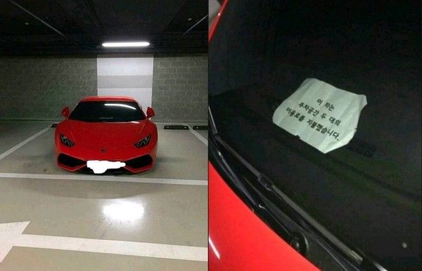 ▼其實這樣的事之前也發生過,地點也是韓國。本月初,有人在停車場看到了一台紅色的藍寶堅尼。那台車也沒有好好停,而是佔了兩個車位。網友走過去一看,發現車子的擋風玻璃上有一張紙條,寫著:「此車已繳納兩個停車位的停車費。」不少人看到後無奈表示:「莫名其妙覺得車主是好人啊」。