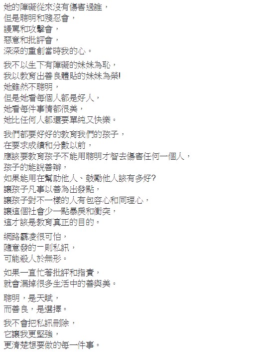 ▼原來有一名毒蛇網友用臉書私訊她,寫道:「還好你的小孩智能不足,否則有你這種母親,他一定會難過得想去自殺」。雖然老師大氣地回應:「一個讀大學的人,用孩子的缺陷來攻擊一個母親,你怎麼做得出來,我的孩子智能不足,但是很善良,很認真,很有愛」,沒想到網友竟然還不放棄攻擊她,繼續寫出許多難聽的話,還表示「顯然你的智障女兒是遺傳」這種難聽的話!