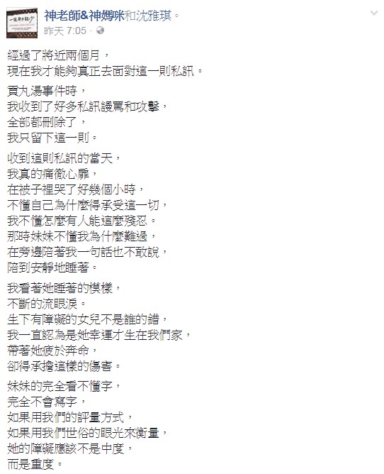 ▼近日這名老師沈雅琪在個人粉絲頁「神老師&神媽咪」po出一則貼文,表示事情被報導之後雖然遭到了讚美與批評,也引來了各種謾罵攻擊。不過有一則網友的訊息她卻一直沒有刪除,直到過了兩個月才能夠面對。