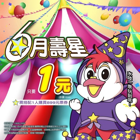 ▼如果你是六月生日(部分的雙子座和巨蟹座)一定不可錯過,只要出示註明生日日期的證件,六月份只要「一塊錢」就能暢玩園內30幾項遊樂設施,水陸一票玩到底。只不過要注意的是,此優惠必須搭配1人購買899元門票,而且僅限網路購票,不能現場購票喔!