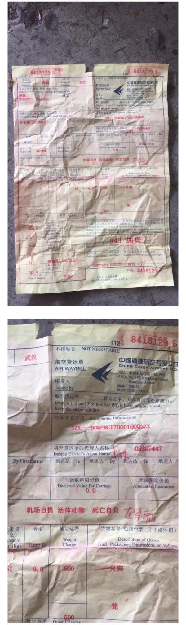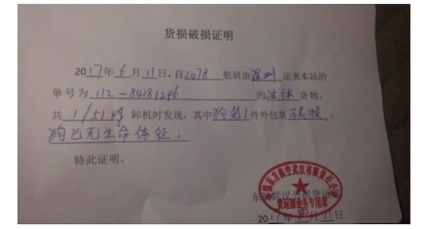 2017年06月18日大陸一位左小姐將家中的黃金獵犬交付給東方航空托運,沒想到等待接回時,竟發現狗狗已經變成一具屍體。東方航空在事後雖然承認疏失,卻以「每公斤100人民幣」(約新台幣445元)的標準賠償,讓她氣憤回:「這不是你們可以用公斤和金錢來衡量的。」