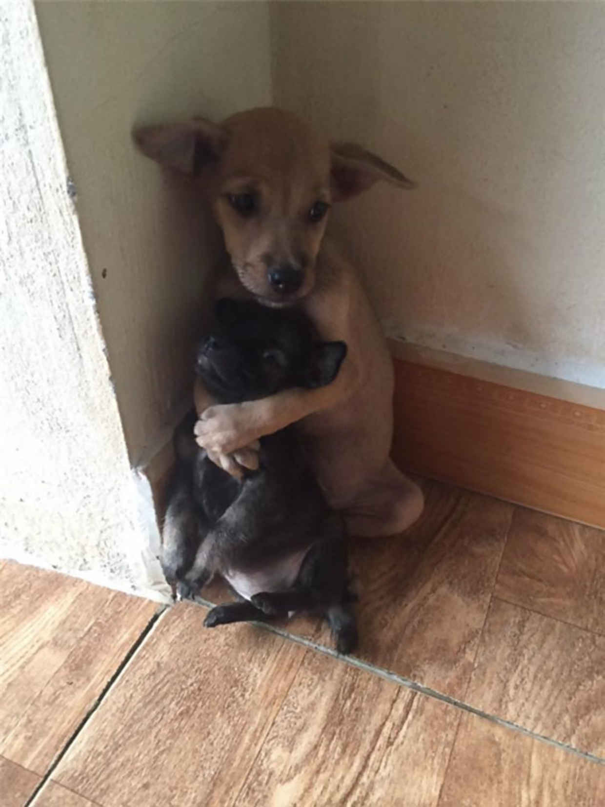 ▼網友在城鎮的牆角間,看到一隻小黃狗緊緊抱住了小黑狗,不願離開對方。