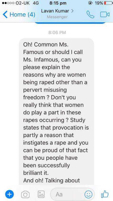 ▼這個網友比較含蓄,想跟她討論女生被強姦的原因,不過他的想法太大男子主義,說那些女人遭遇這樣的事是活該。