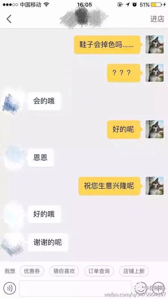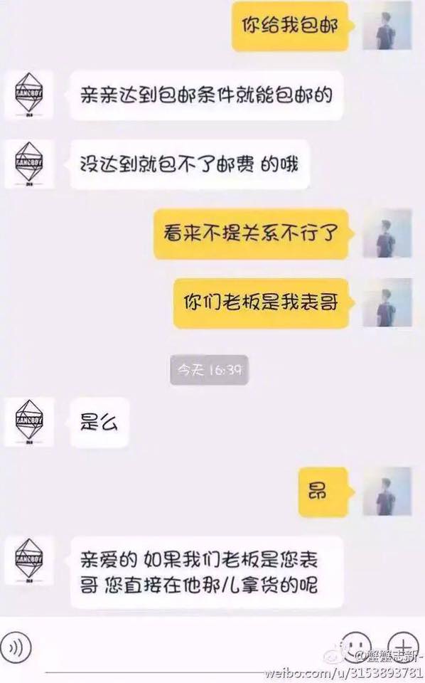 2017年07月06日常在網路上買東西的大家,一定都會有跟賣家客服交流的經驗,這些網拍客服有些是店主自己兼任,也有一些是另外聘請來的員工。中國的網路經濟十分蓬勃,擁有數不盡的賣家就一定也有數不盡的客服,人多質素就一定會參差不齊,詢問他們問題時有時候會得到一些讓人啼笑皆非的回覆,來看看他們是怎麼回覆的吧: