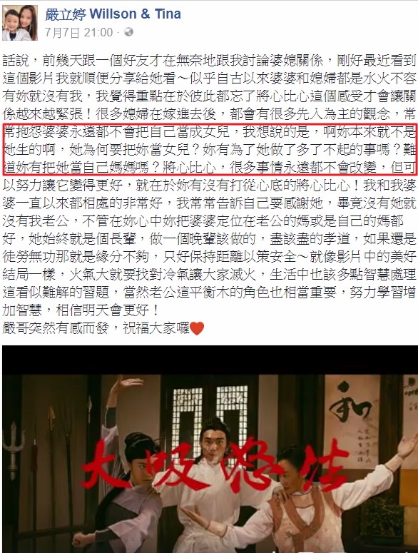 ▼她還分享了一則講述婆媳關係的有趣廣告,說:「就像影片中的美好結局一樣,火氣大就要找對冷氣讓大家滅火,生活中也該多點智慧處理這看似難解的習題,當然老公這平衡木的角色也擔當重要,努力學習增加智慧,相信明天會更好!」