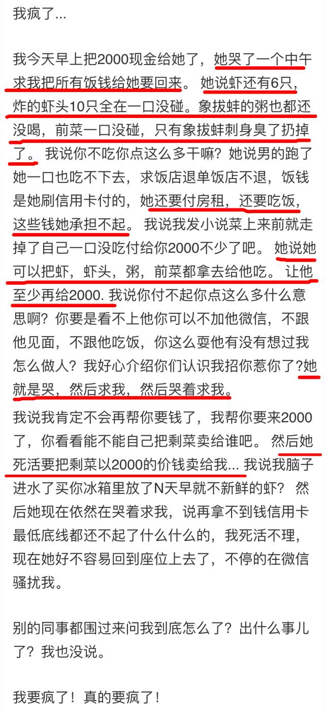 ▼原PO被煩得不行,問她吃不下為什麼叫那麼多菜?她表示男生走後一個人沒胃口,這才吃不下,又說可以把剩菜拿給男生吃,讓他再給2000元。原PO覺得很無奈,那些剩菜已經放了太多天,根本不能吃,但女生苦苦哀求,還說如果再拿不到錢,會連信用卡的最低限額都還不起。
