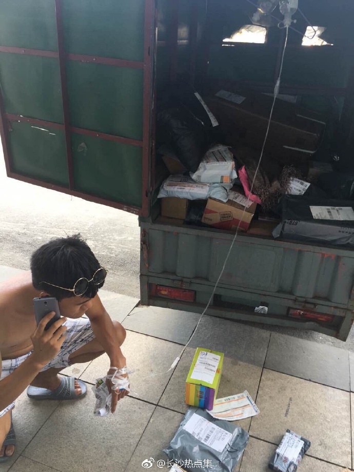 ▼這張照片很快引起了網友們的關注,送貨員謝塘勝也被找了出來。有人問他為什麼一邊打點滴一邊工作,他說自己前兩天就中暑了,扛到那天才去醫院,又怕耽誤送快遞被投訴,所以一邊打點滴一邊送,還多送了一個小時的貨。