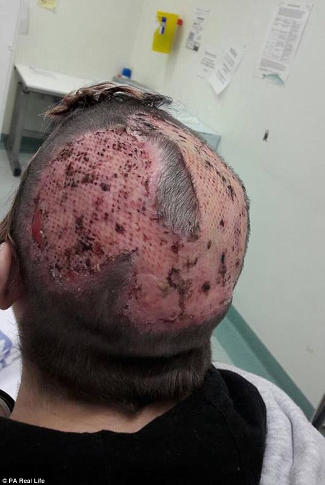 ▼最後醫生確定,Kirsty屬於化學燒傷,必須接受植皮手術。他們先把她的頭髮剃掉,然後從她的右腰取了一塊皮膚做移植。不過腰部的皮膚沒有毛囊,Kirsty的頭頂再也長不出頭髮了。