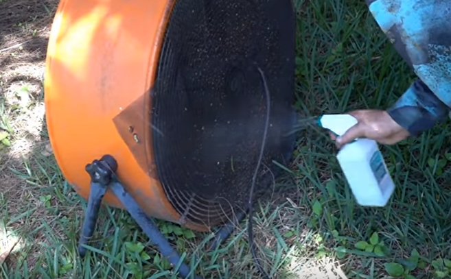 ▼接著就要製作滅蚊機器。他準備了風力超強的工業用電風扇,把網子黏在電扇後面。接著把兩台電扇放在Rocky兩邊,當然風扇是背面朝向狗狗的。第二天起床,網子上全都是蚊子。這些蚊子沒有死掉,Dan噴上酒精殺死了牠們。
