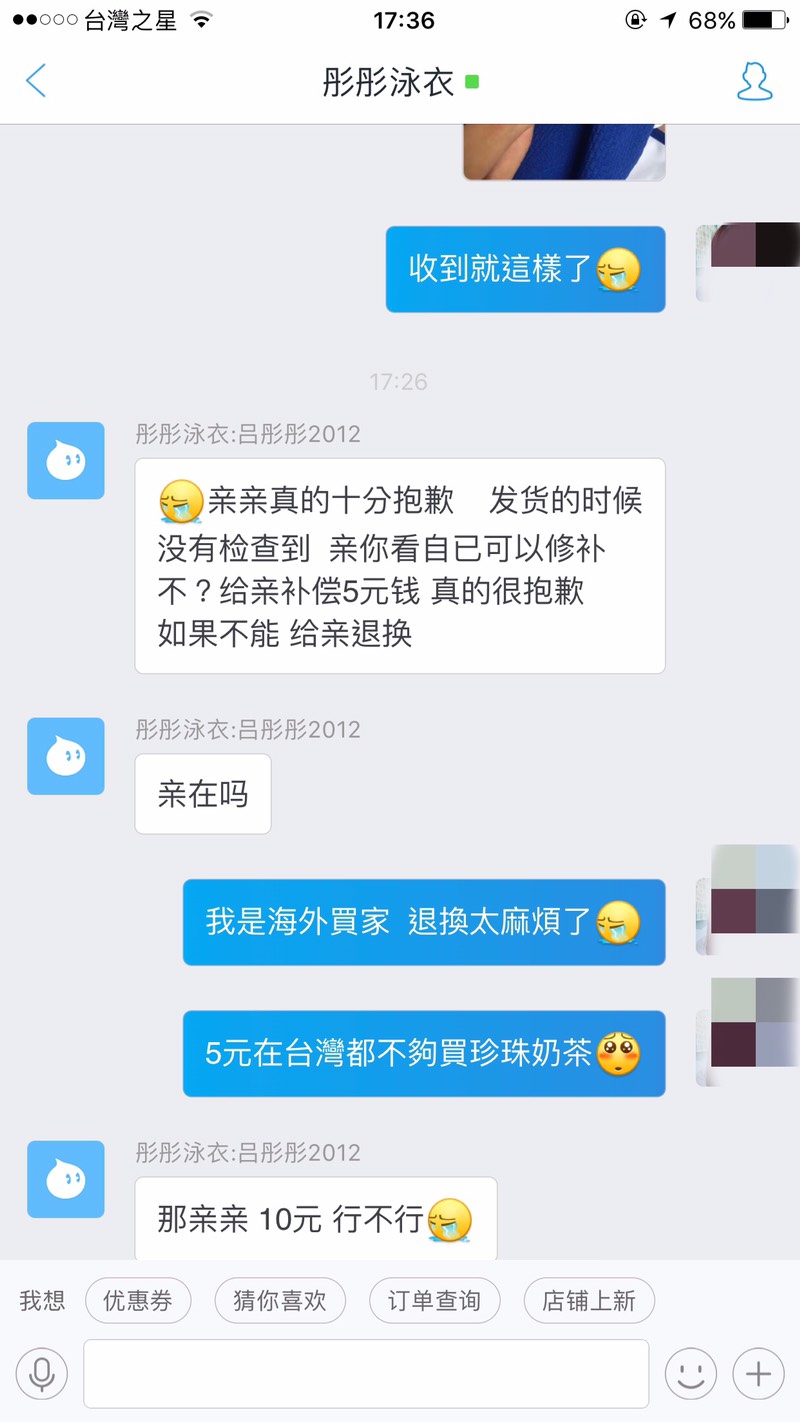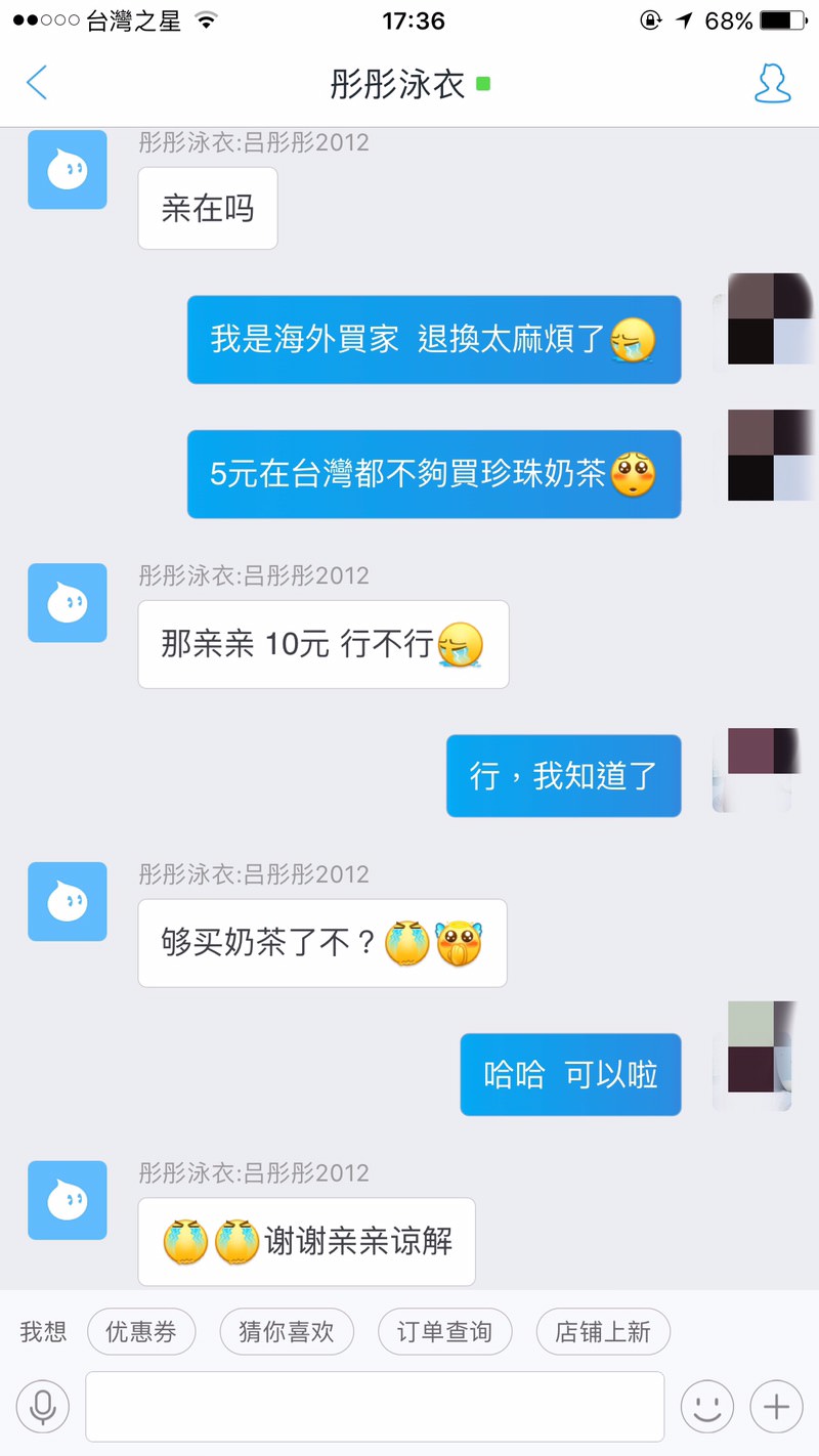 ▼以下是網友與客服的對話,客服表示要補償5元人民幣(約新台幣22元)給這名網友,結果網友回覆自己是海外買家,5元在台灣連珍奶都買不到。