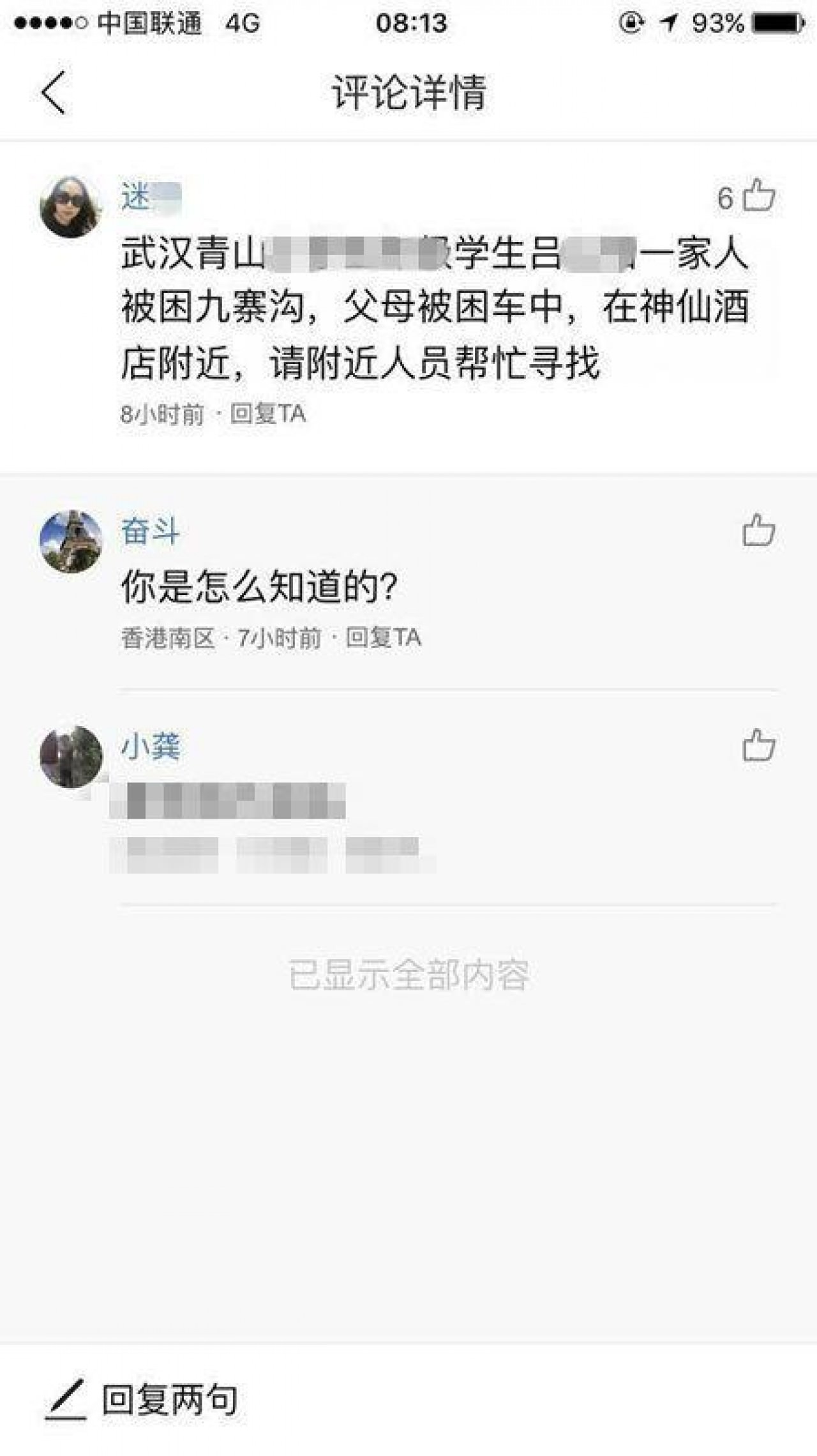 ▼武漢網友紛紛分享這則消息,後來警方找到平安無事的呂心怡,但發現她父母都已經雙亡。呂心怡則對胡冬敘述了事發經過,並表示她當時隻身在車外,車內的父母和大姨生死未卜,讓她不知如何是好。
