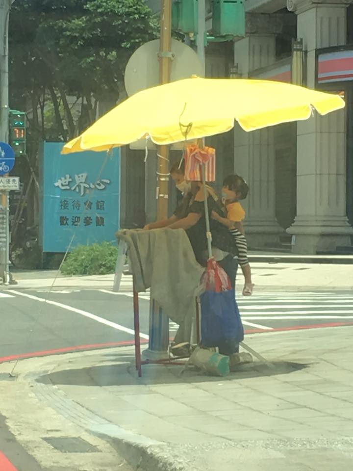 ▼網友在林口區忠孝三路、文化路一段的路口看到這位賣便當的媽媽,只見她在大太陽底下只撐一把大陽傘,背著小孩,頂著高溫在賣便當,讓網友心疼說:「我從不吃路邊的便當,但是我不得不買!」