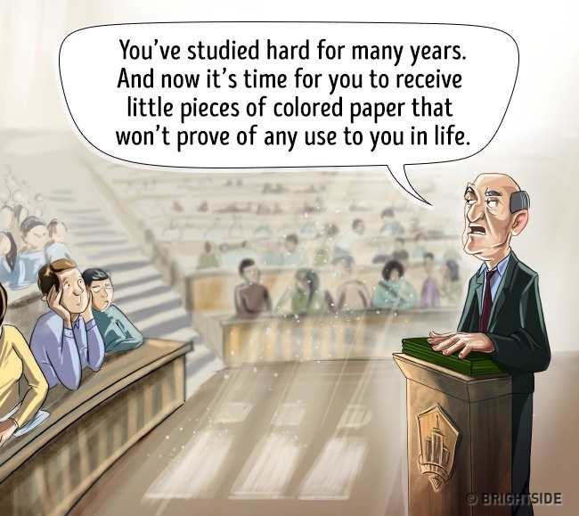 ▼5.畢業典禮上校長說:「你們努力學習了好多年,現在是時候收到對生活沒有任何用處的一紙證書了。」
