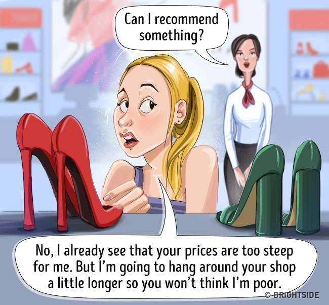客人:「不必,我已經看過價格,對我來說都太貴了。不過我打算再逛一會兒,免得你覺得我太窮買不起。」